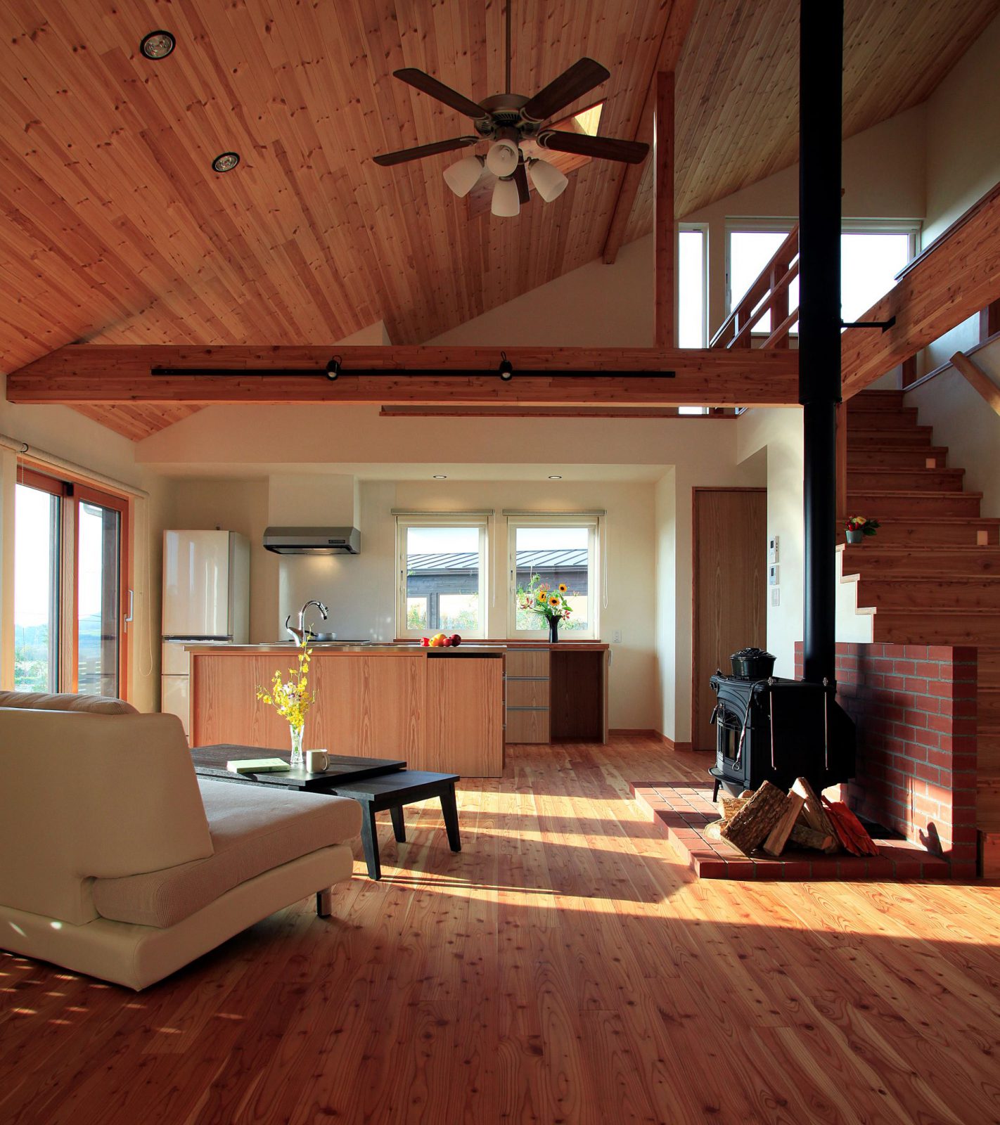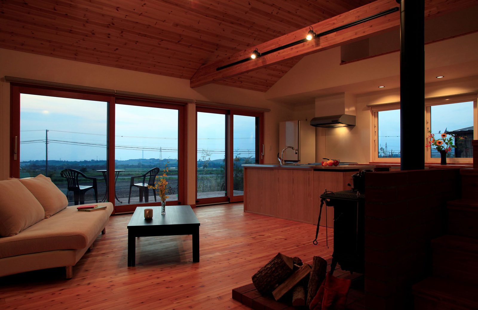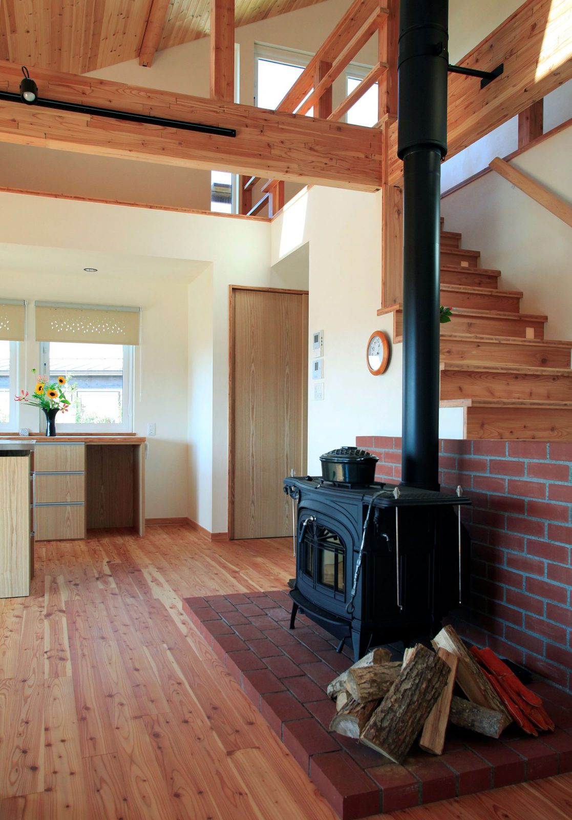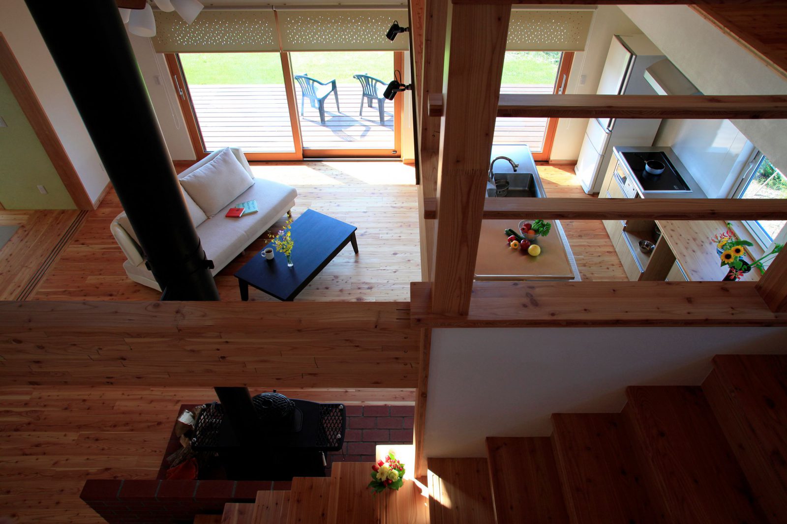 小松建設のしごと 2階建て HOME 小松建設のしごと 春を彩る庭を楽しむ家 春を彩る庭を楽しむ家 2階建て 薪ストーブ 造作キッチン さとやま暮らし 吹抜け 和モダン 景観を楽しむ ウッドデッキ 木製サッシ 市町村伊達市完成年月2010年