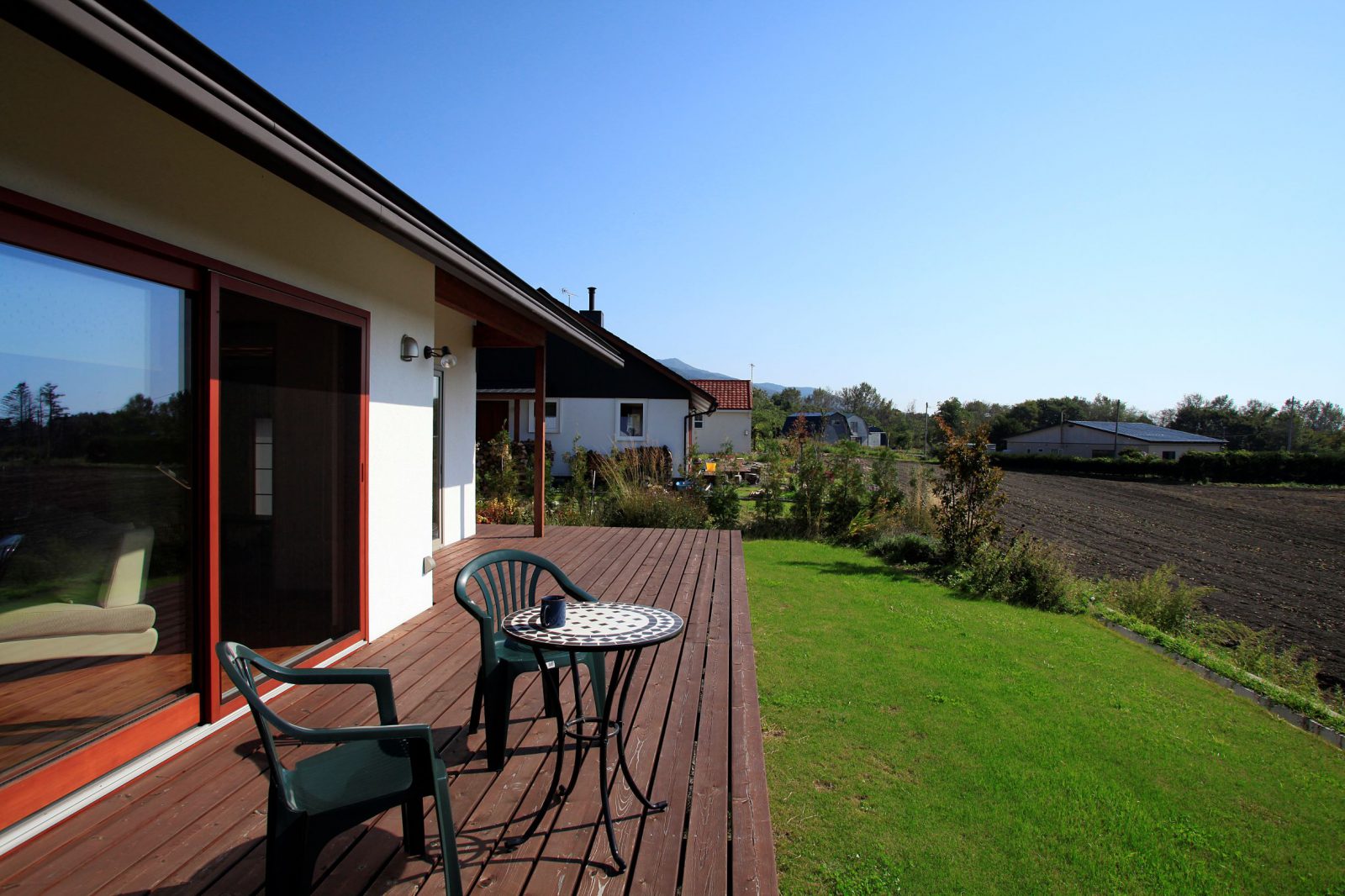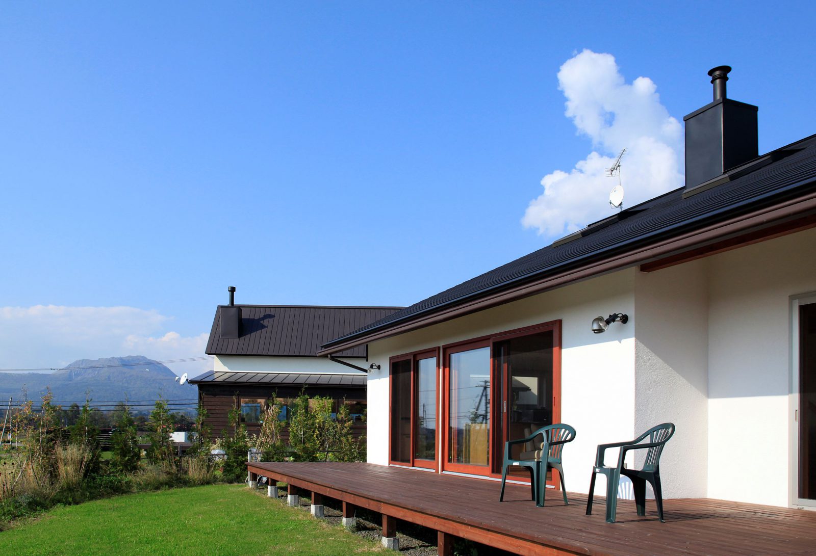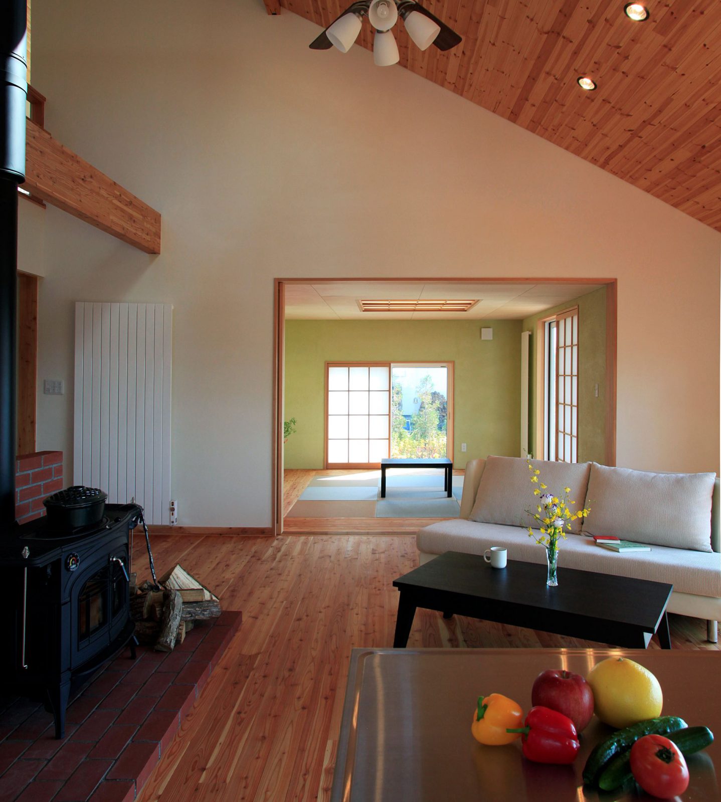 小松建設のしごと 2階建て HOME 小松建設のしごと 春を彩る庭を楽しむ家 春を彩る庭を楽しむ家 2階建て 薪ストーブ 造作キッチン さとやま暮らし 吹抜け 和モダン 景観を楽しむ ウッドデッキ 木製サッシ 市町村伊達市完成年月2010年